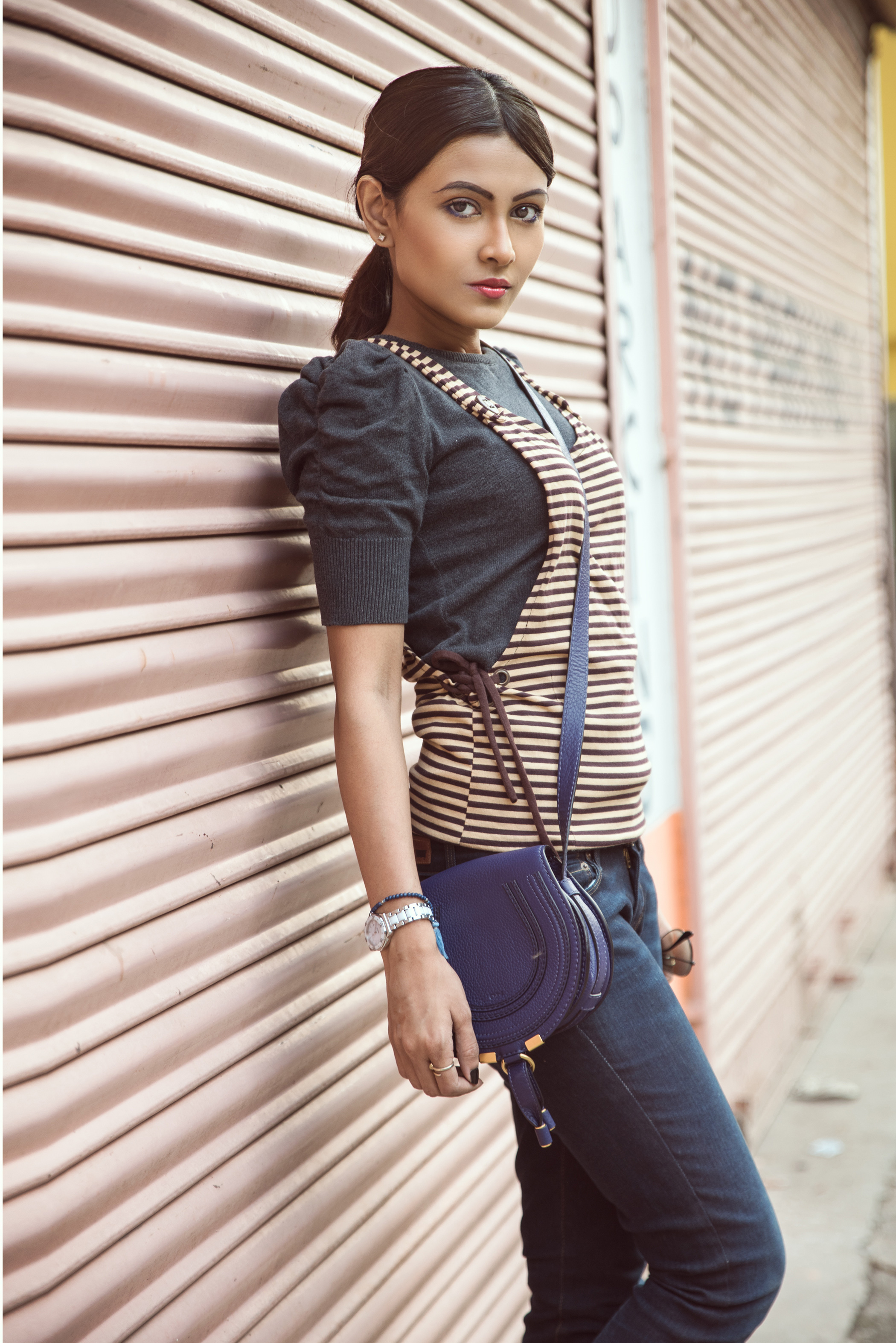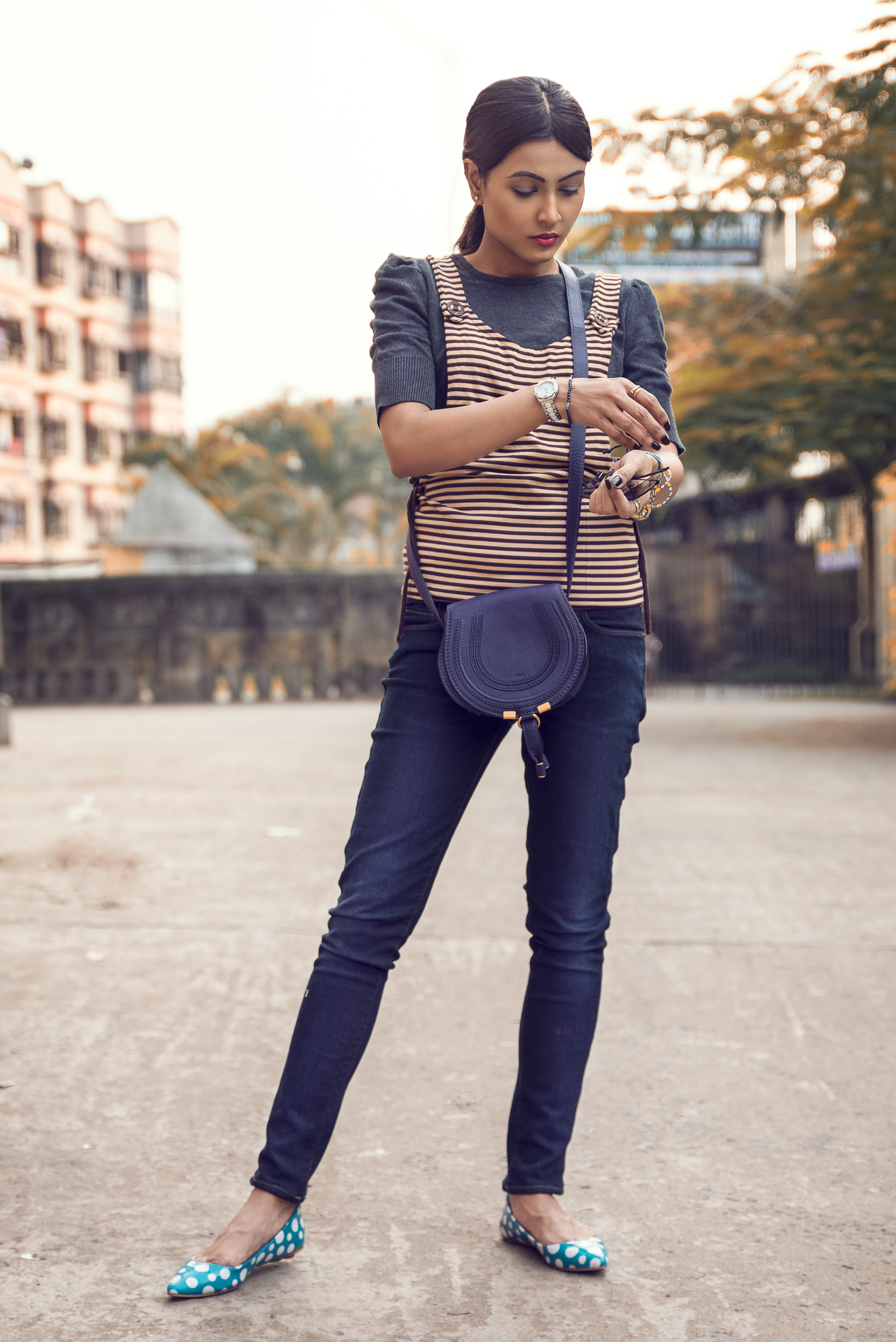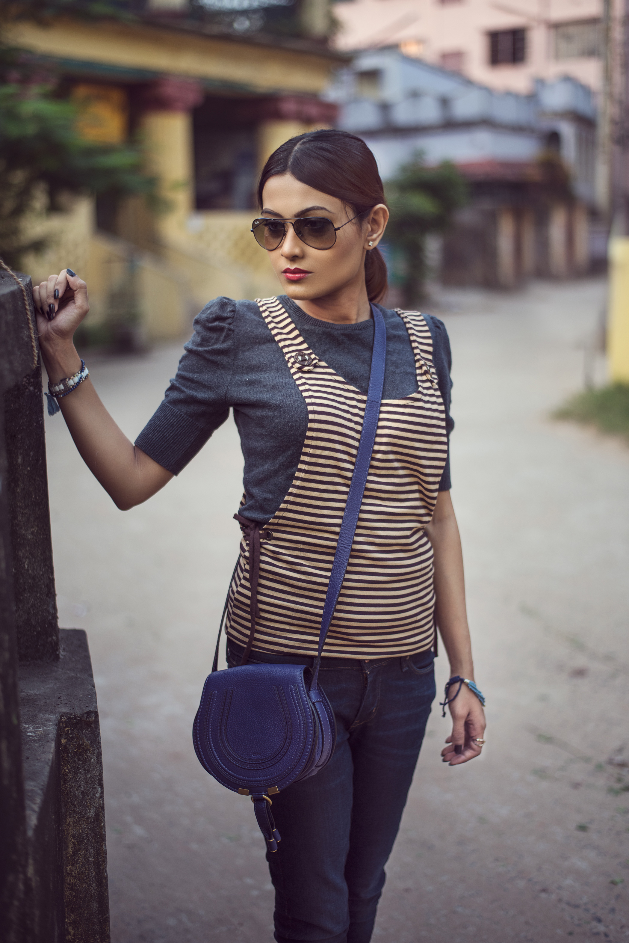 As you know, after getting all those supportive messages, the first thing that I did the next day (i.e, Sunday) was capturing this look. No more hiding. I love you all and vice-versa. So I had to do this. Though the look is extremely casual, I played with the layers keeping the present weather in mind. I used a grey sweatshirt and nicely layered it with my striped overall top and denim. If you don’t have an overall top, you can go for a striped overall altogether as it brings an edgy appeal. Overall is in trend and this is the ultimate season to make its full use as it’s the best thing to play the layering game strongly. I find striped overall extremely appealing and a woven top offers an adequate coziness which we crave for in this season in particular.